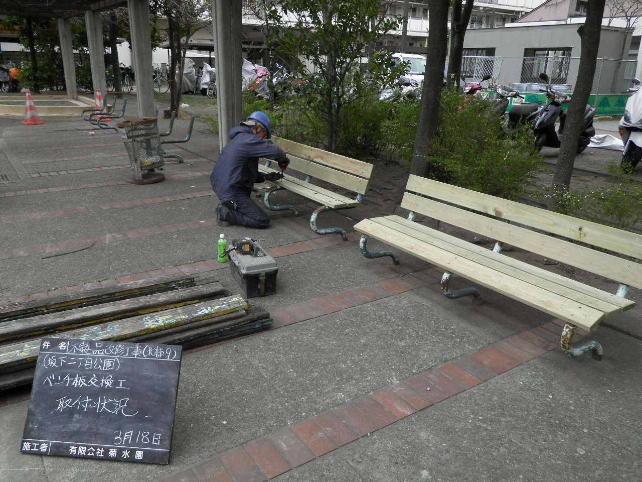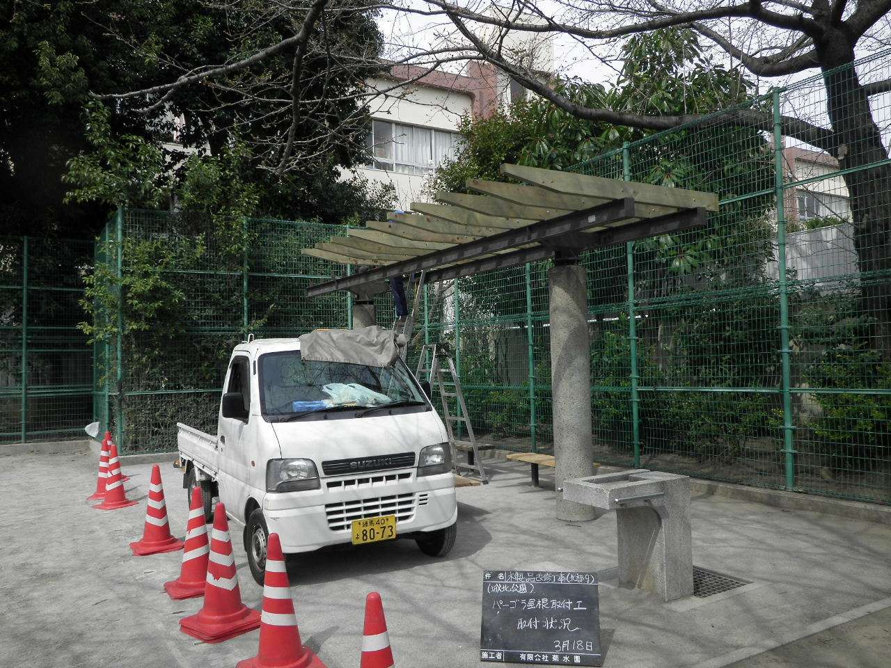 板橋区でパーゴラ屋根の取替とベンチの板の取替を行いました。