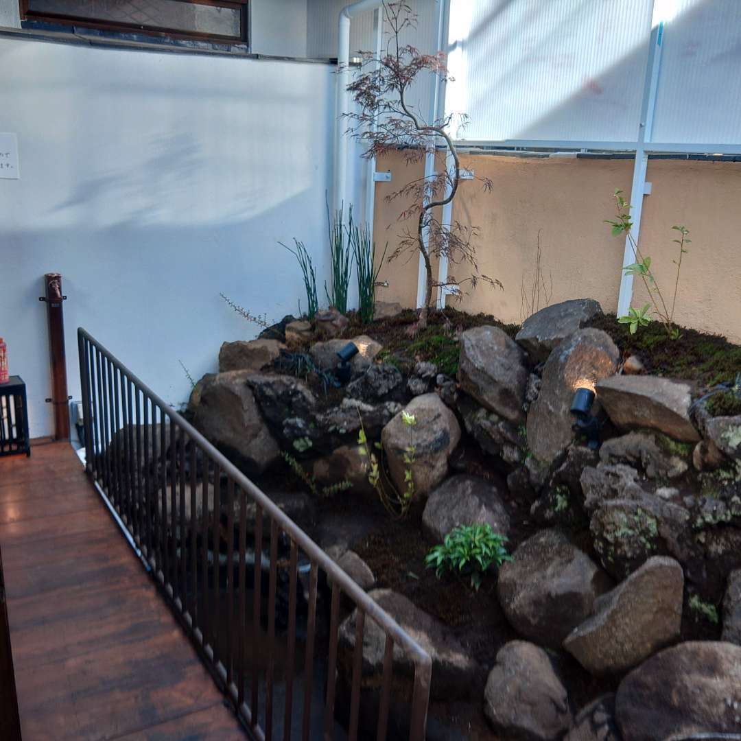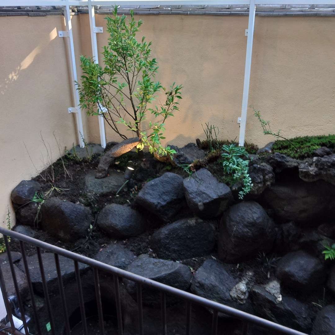 中野区の商業施設中庭の改修工事です。自然石を再利用し石を組み直し、植栽をしました。