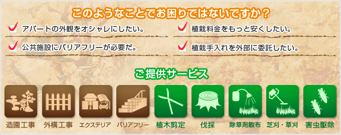 樹木剪定・刈込・伐採・抜根、芝刈り、草刈り、手取り防除、施肥、薬剤散布、害虫防除