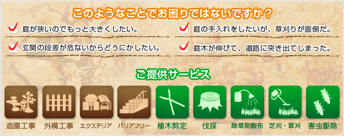 東京都、埼玉南部を中心に造園・外構・エクステリアなどの工事から、植木の剪定、伐採、草刈、植栽まで幅広く承っております。